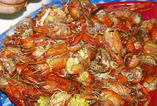 This is after the hot tub bath! Any crawfish that have straight tails, instead of curled tails are picked out. Then it is time to 'suck head and eat tail'. Eating crawfish is slow process and half the fun is getting some ready to eat. Everyone in the neighborhood stopped over. The smell of crawfish in the air brings people out of the woodwork. About 12-14 people were here for our crawfish boil.